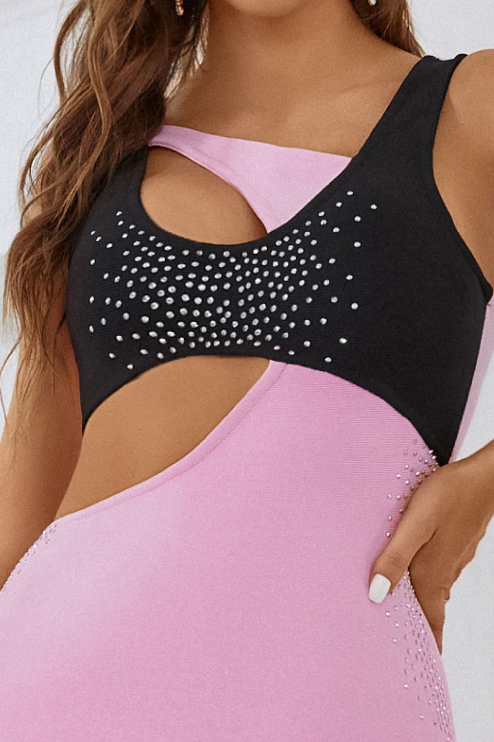 Contrast Rhinestone Cutout Split Asymmetrical Dress