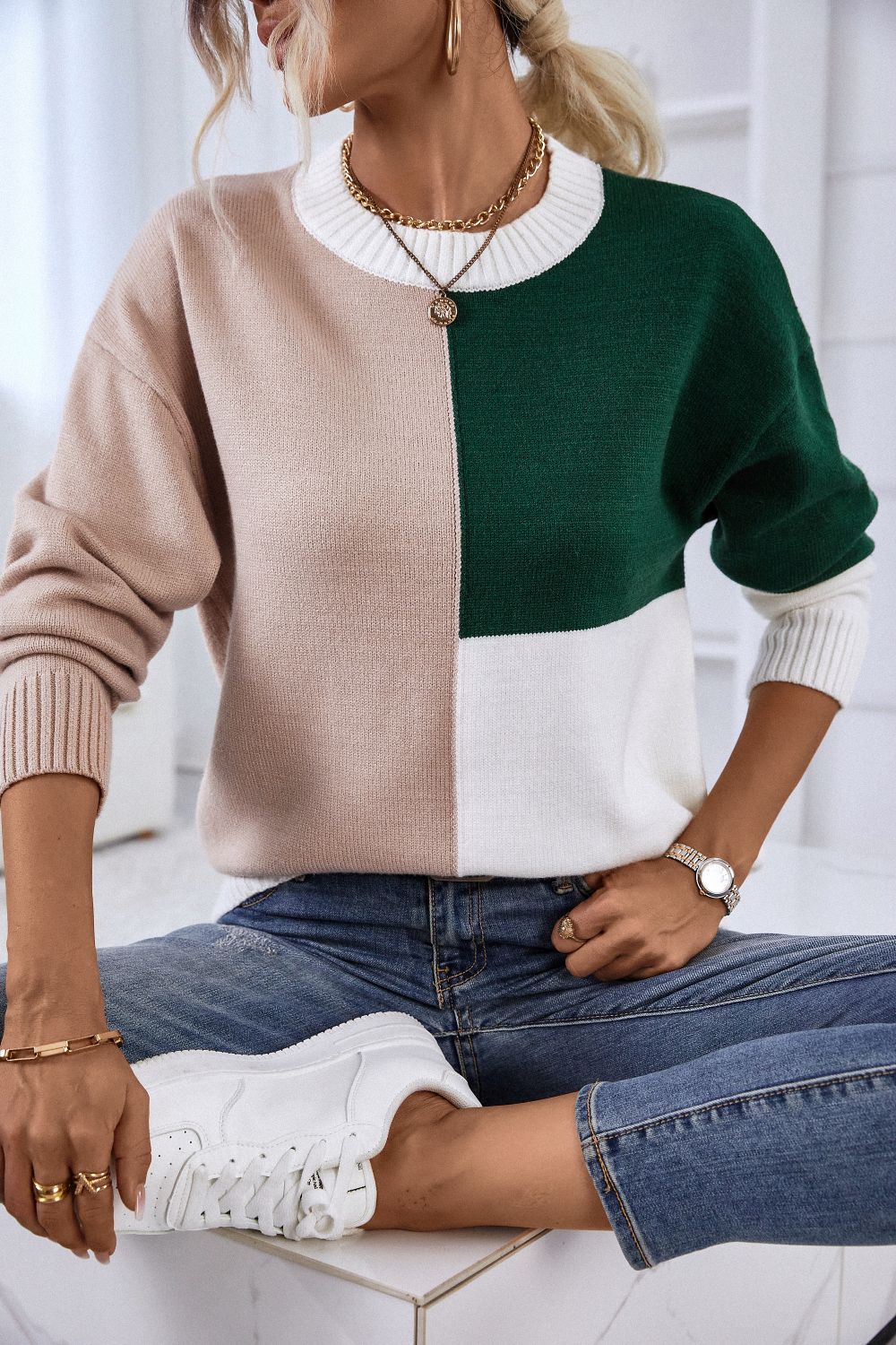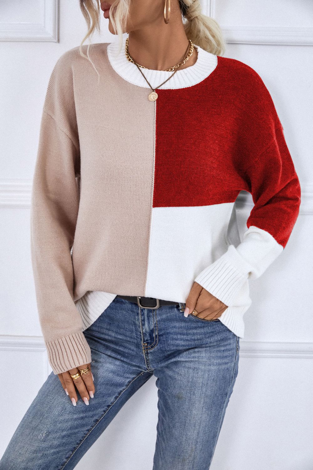 Contrast Ribbed Trim Round Neck Sweater