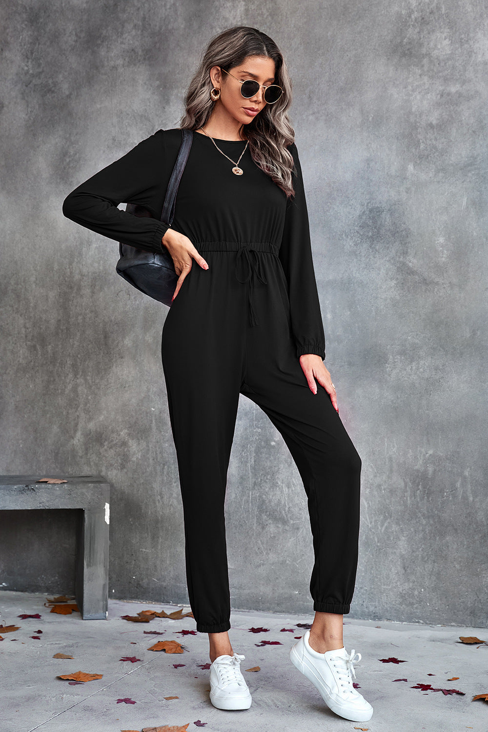 Drawstring Waist Round Neck Long Sleeve Jumpsuit