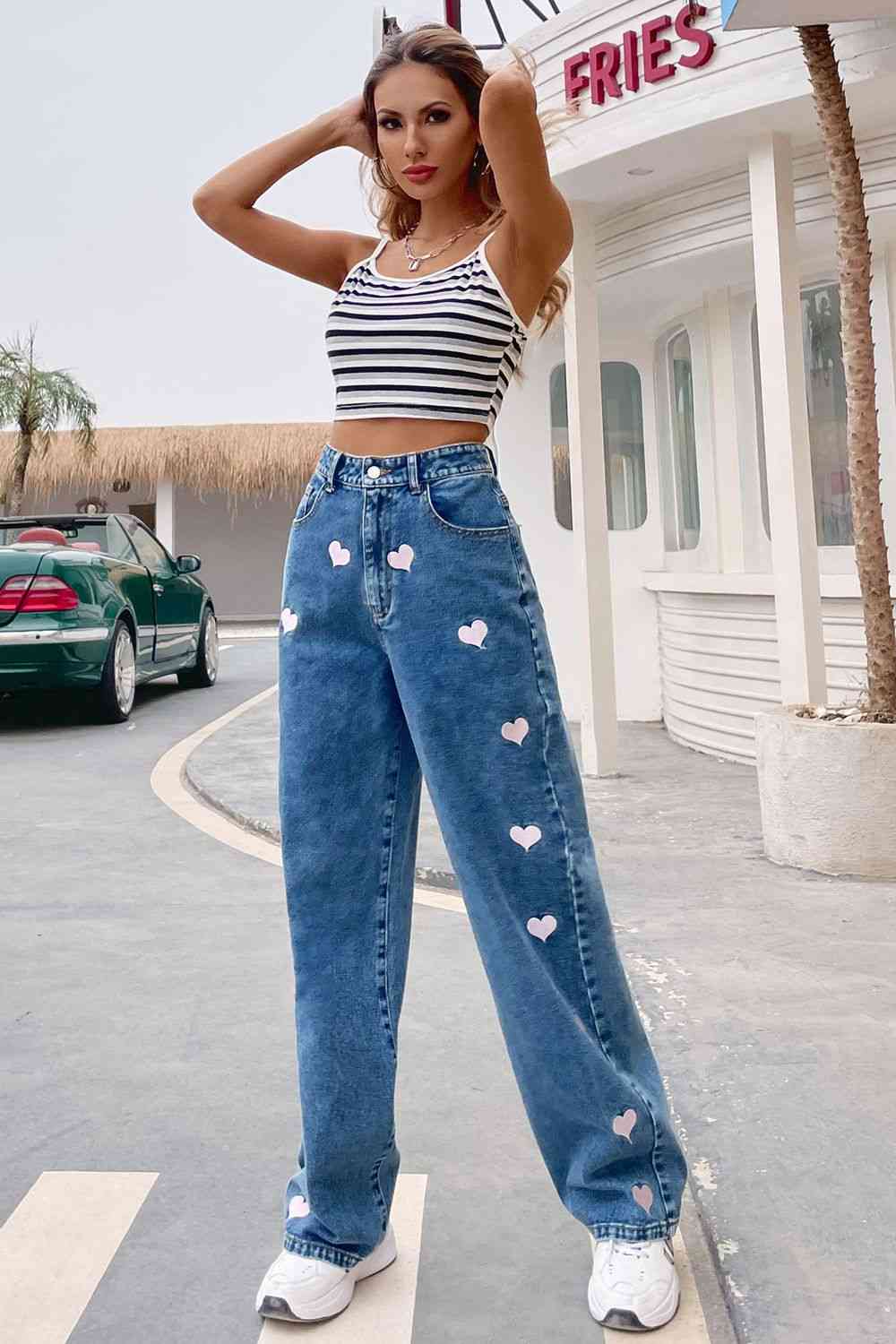 Heart Print Buttoned Jeans