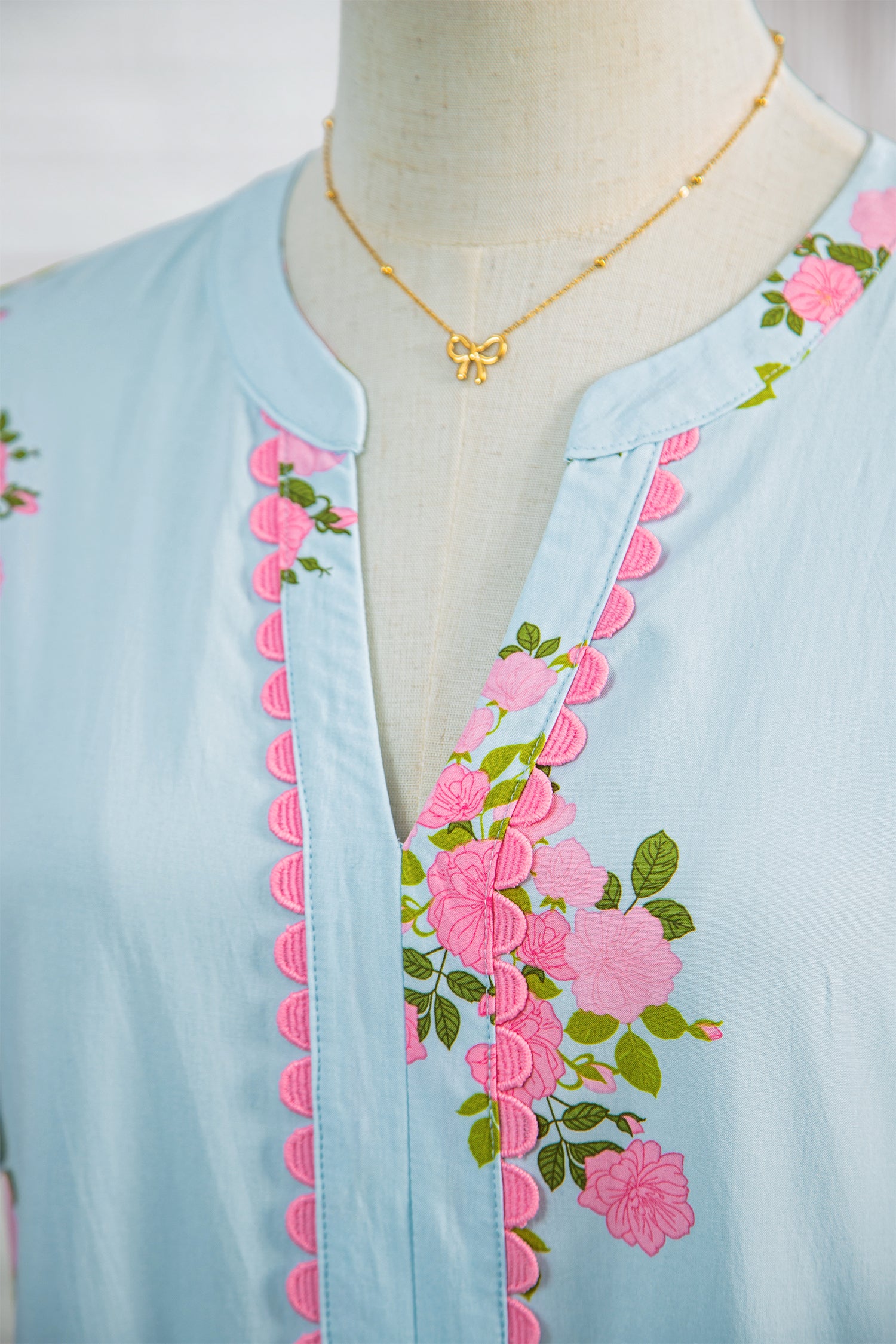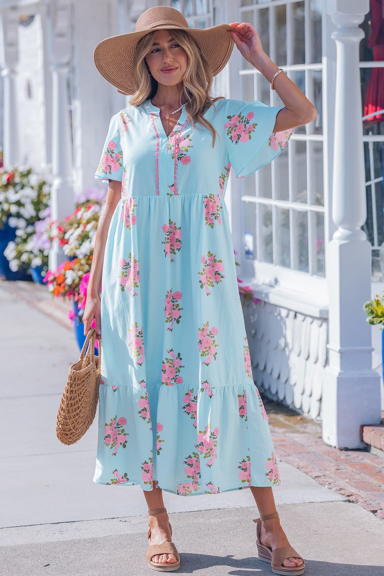 Sky Blue Notched Neck Flutter Short Sleeve Floral Print Maxi Dress